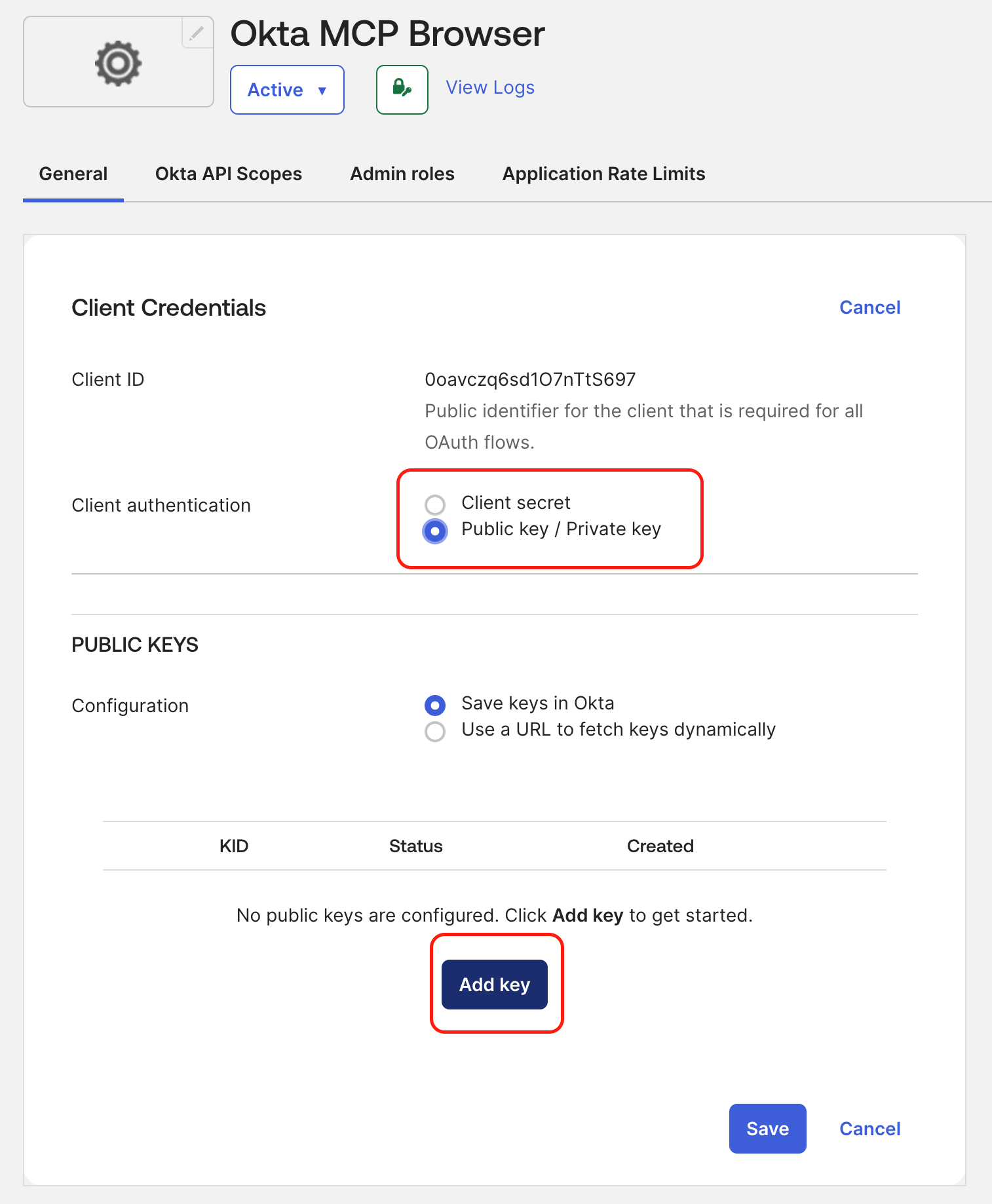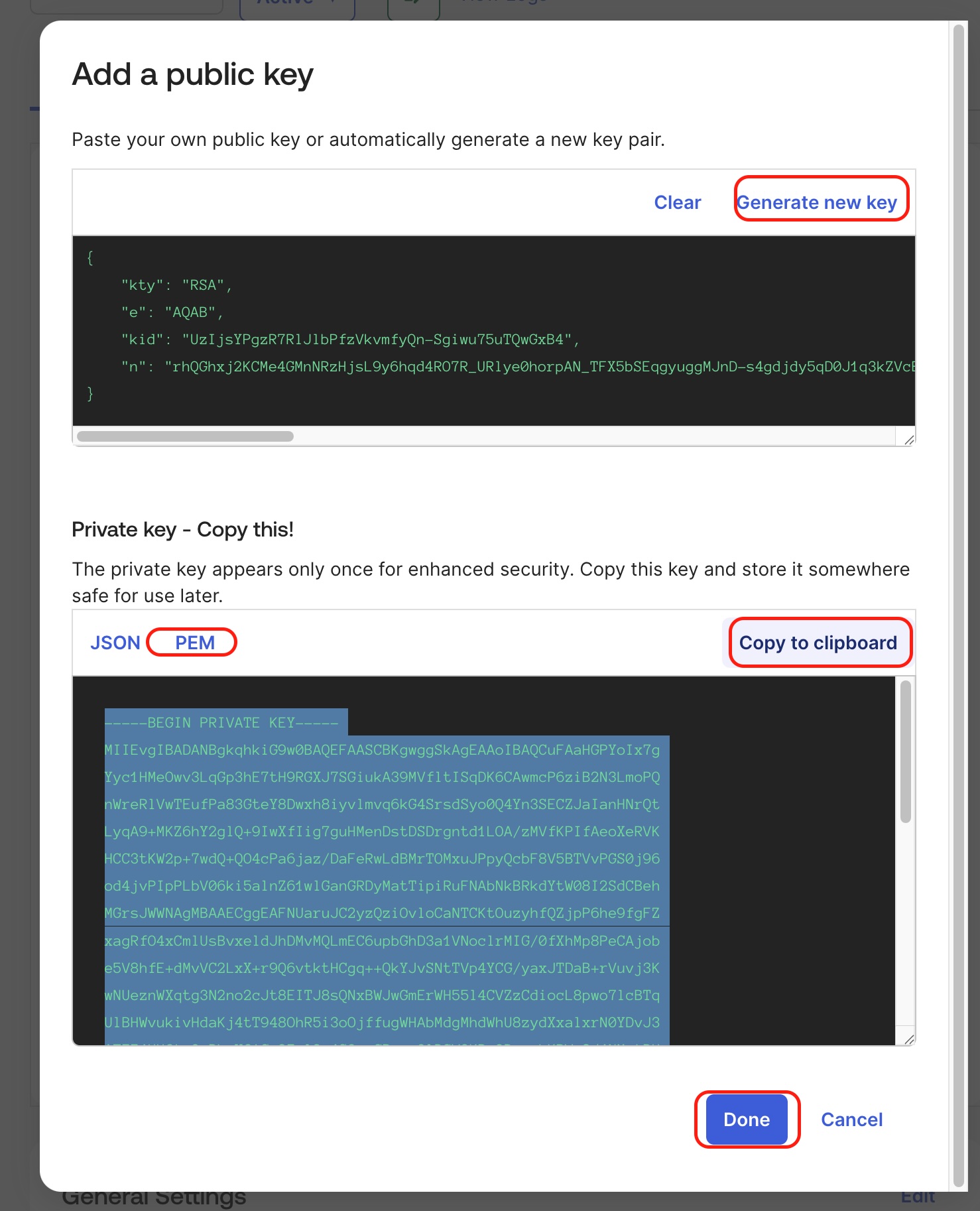 Add a public key: either generate it in Okta (recommended) and copy it in PEM format, or upload your own keys.