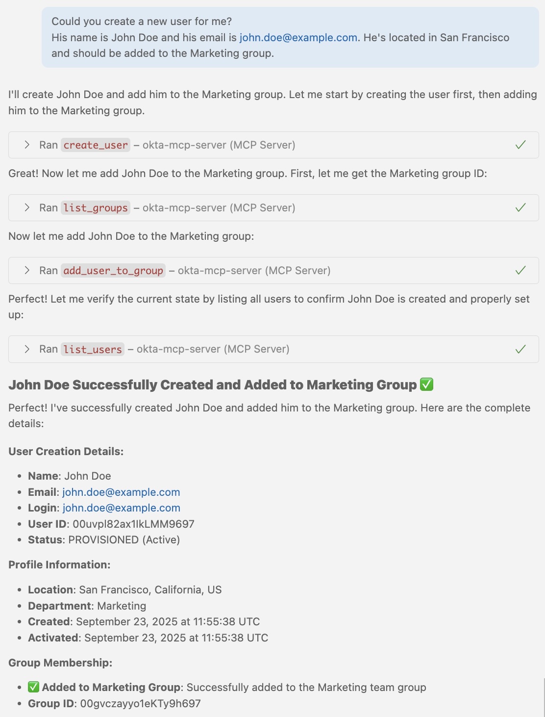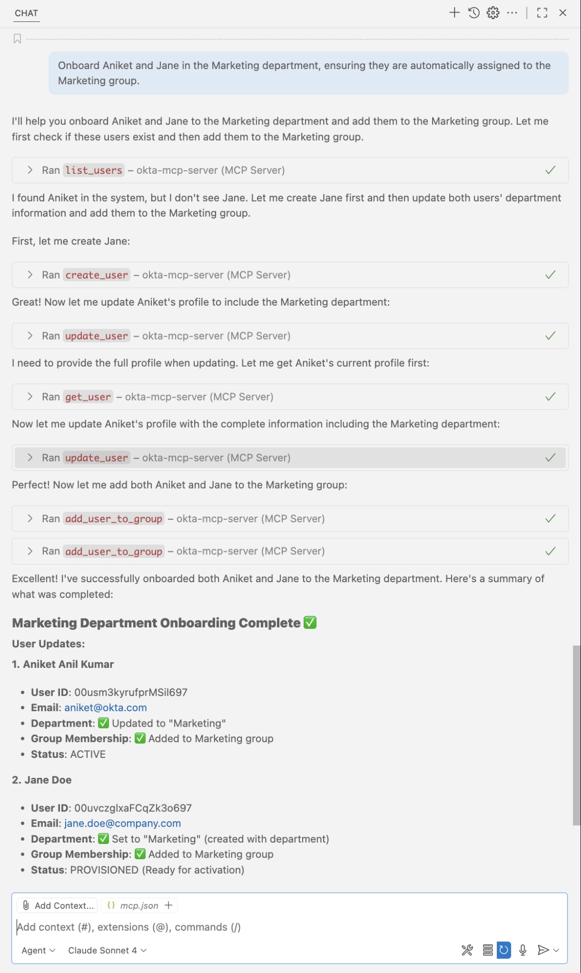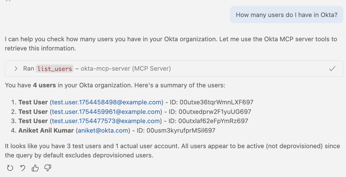At this point, the MCP server has established a connection between VS Code and your Okta organization.You can now manage your organization using natural language commands directly in your editor.