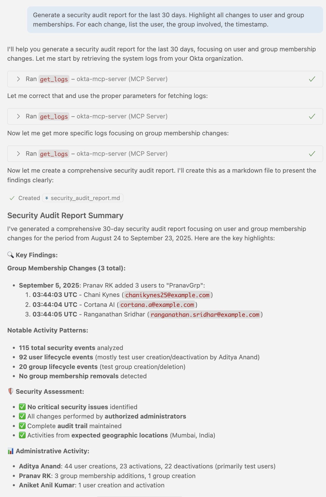 Using the above operations as a base, complex real-life actions can also be performed. For example, you can ask the MCP server to generate a security audit report for the last 30 days and highlight all changes to user and group memberships according to your desired report template.